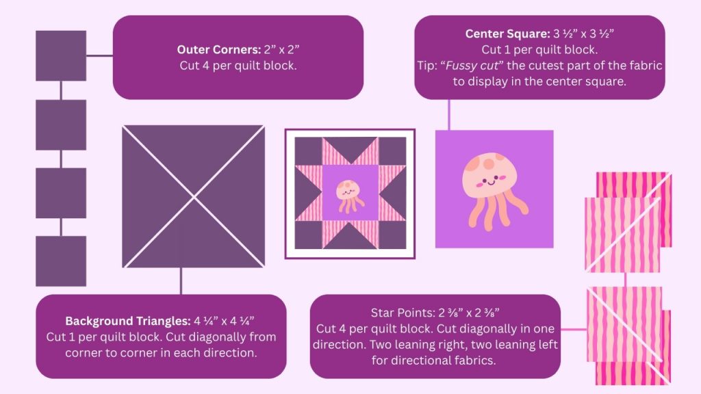 Here is quick guide to cut sizes of the pieces I used to make these sawtooth star quilt blocks.