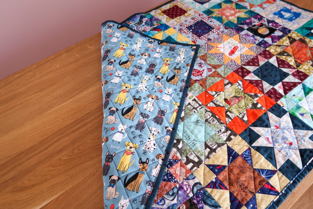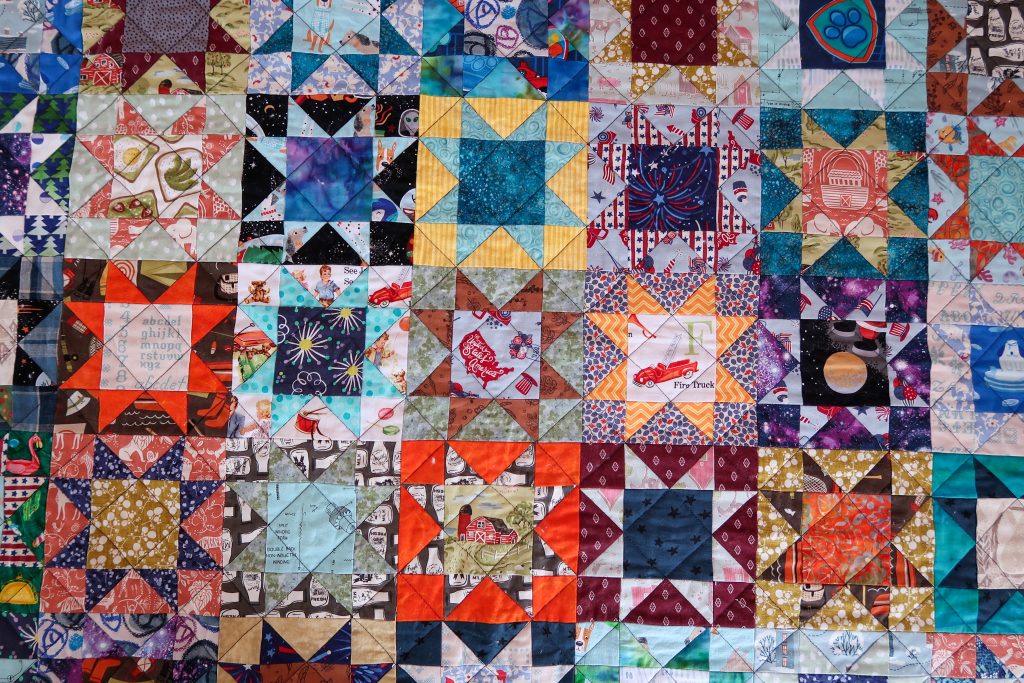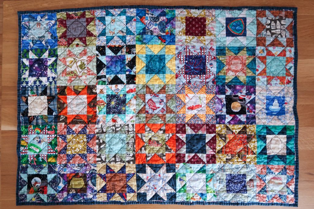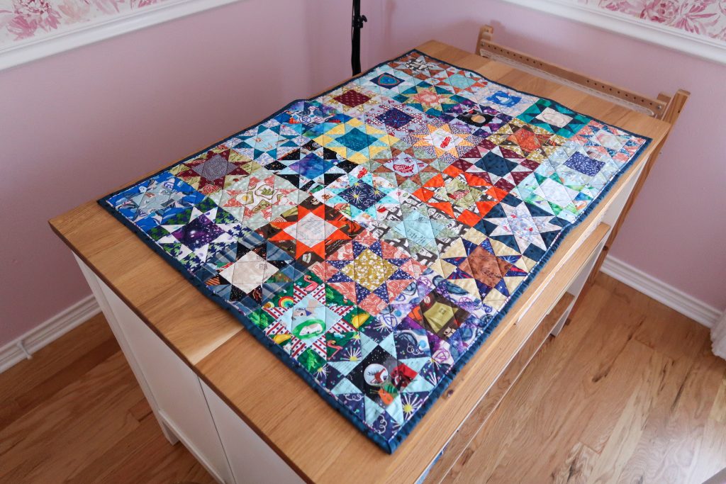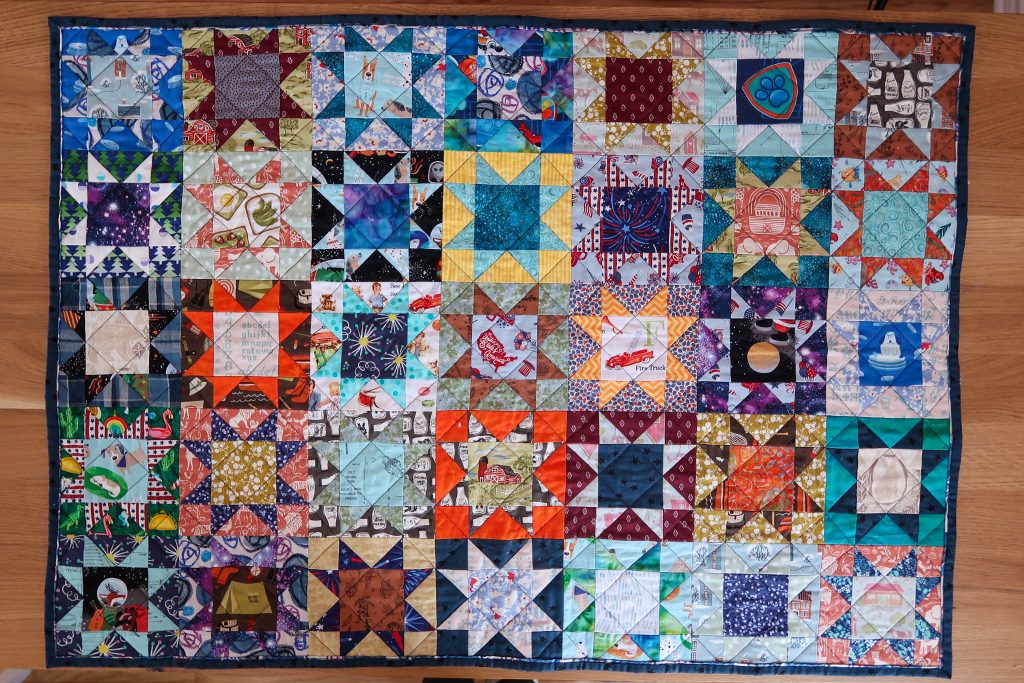 The quilting pattern I followed was using the diagonal lines of the stars. I used navy blue thread for high contrast. As a side note (but hopefully helpful), my quilting foot wasn’t gripping my fabric well and wasn’t functioning as it has in the past. I’ve used it for many giant projects, so maybe it just wore out. Anyway, I bought a new walking foot and it was a night and day difference. The new foot works exactly as it should. Problem easily and inexpensively solved. In that order I also added fresh grippy gloves. They make quilting so much easier.