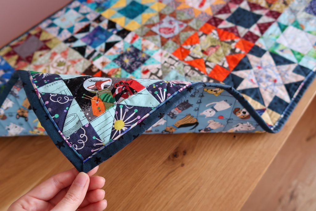I strayed from my usual quilt binding process and tried a flanged binding. The flange fabric is cut 1/4″ wider the the main binding fabric, sewn together, and pressed with the cut edges even. The fold leaves 1/8″ of the flange fabric exposed on the front side. I attached it to the back of the quilt first then wrapped it around to the front and stitched it down through the flange fabric. No hand sewing for this binding. I think the widths I used for the binding was 1.5″ for the main binding and 1.75″ for the flange fabric.