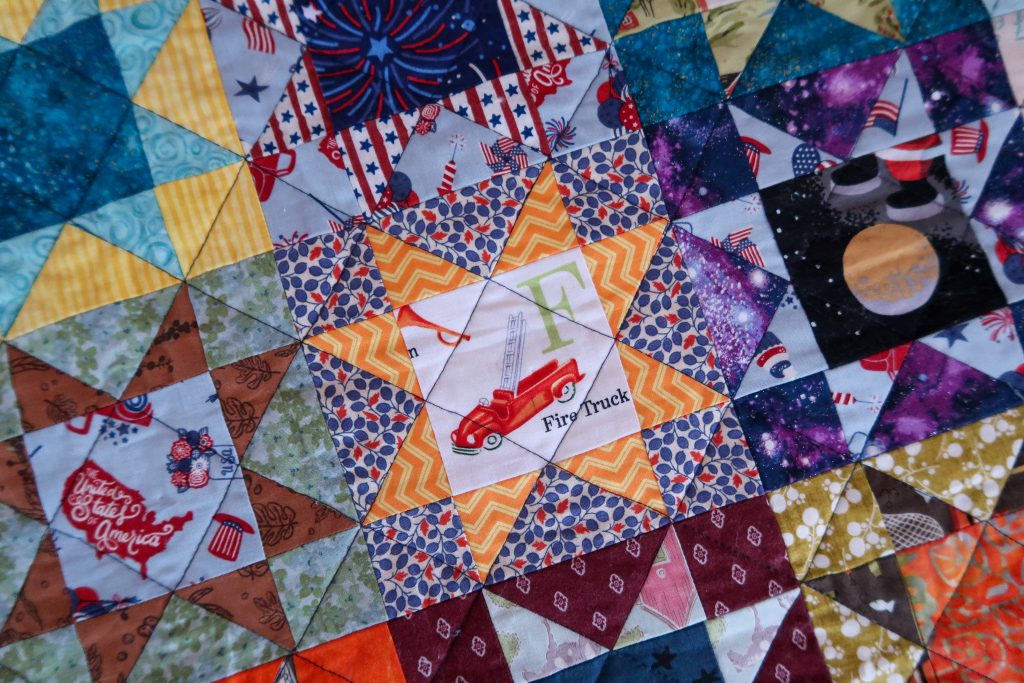 I have made each of my daughters a special quilt and now I’ve made one for my baby boy, George. He recently turned 1 and is still in a crib, so I decided to make him a crib/cuddly sized quilt. I wanted it to be very busy with lots of boyish fabric prints. I rummaged through my collection of quilting cottons and bought a few fat quarters from a local fabric shop. There are a lot of memories collected in this quilt through the fabrics. Many have been used in other projects like one of my daughter’s quilts, shirts for my husband, one from my quilt on my bed, etc. I fussy cut a lot of the fabric to highlight images in the fabrics. Some of the blocks are arranged with a theme and others are arranged based on contrast. This was a very playful design… energetic, bright, entertaining. Just like boys. I do hope he finds this to be very interesting to look at as he gets older and we use this as we would a first words book. *point* “Firetruck. Barn. Alien. Dog. Moon.”